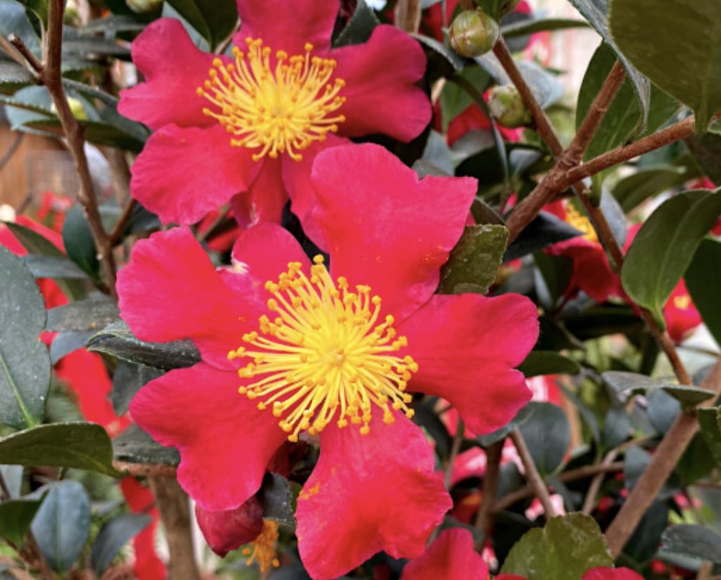 Deze Camelia bloeit van november tot januari met prachtige rode/roze bloemen met een geel hart, het is dus een aanwinst voor iedere tuin!